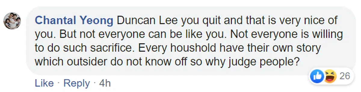 Duncan Lee,你辞掉了工作,你非常有善心。但并非每个人都能像你一样。并非每个人都愿意做出这样的牺牲。家家有本难念的经,你身为外人,凭什么要去评价他人?