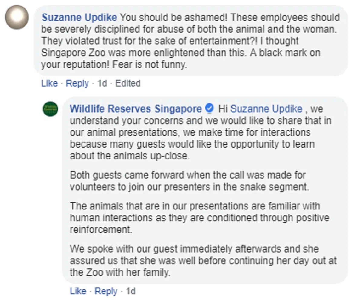 保育集团就此回应说:“我们理解您的担忧,我们想分享说,在动物展示表演中,我们腾出时间进行互动,是因为许多访客希望有机会近距离了解动物。