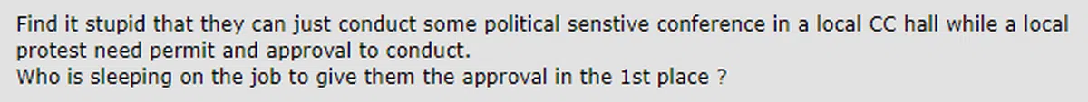 “觉得很愚蠢,他们可以在本地民众联络所的礼堂举办一些政治敏感的会议,可是本地的示威却需要准证和获得批准才能举行。谁批准他们(办活动)的?他是边工作边睡觉吗?”
