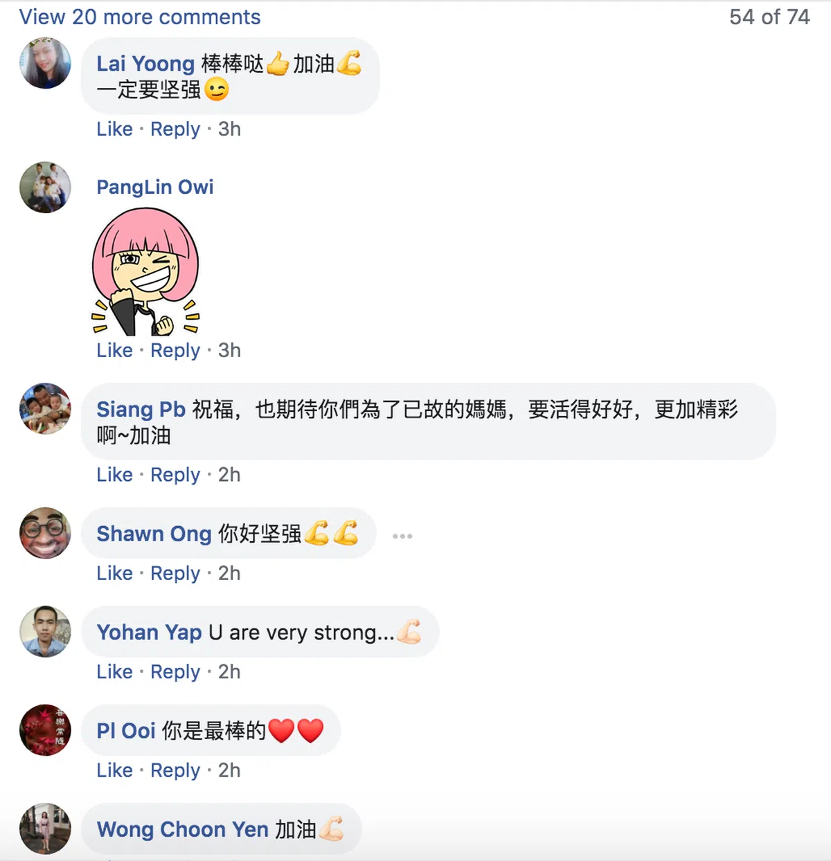 这则贴文吸引到3万8000名网民点赞和给予哭泣和爱心符号,帖文一共被转发4000多次,帖文下有将近1万2000条留言,大多数都是网民向她母亲致哀,也为佳欢打气。