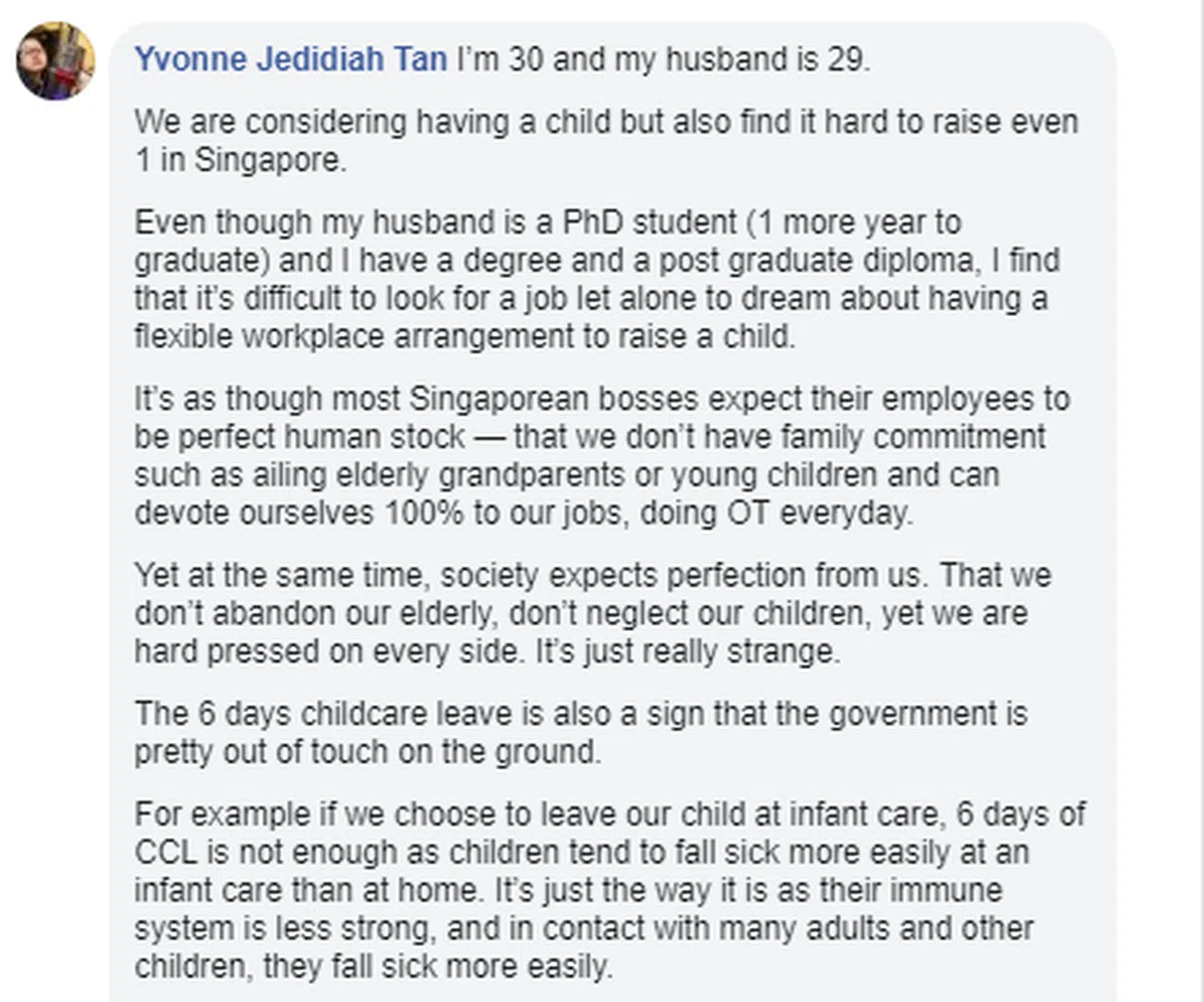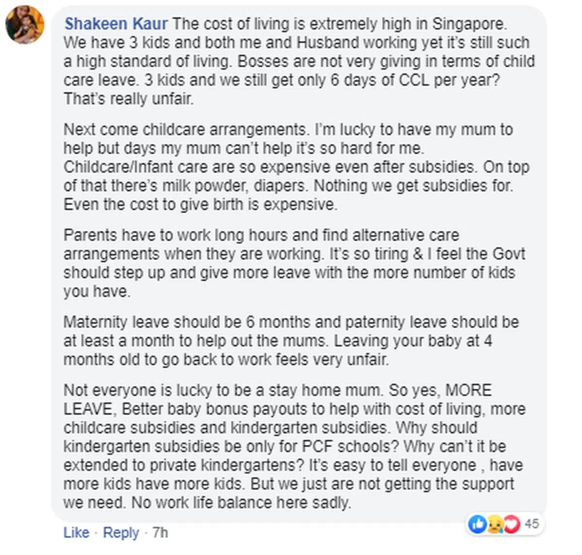 在留言中,很多父母把生育率下滑的原因归咎于育儿假太短,他们建议延长育儿假,并根据育有的孩子人数来调整育儿假的长短。目前无论你有多少个孩子,在职父母每年各有六天的育儿假。