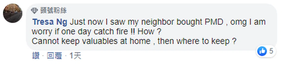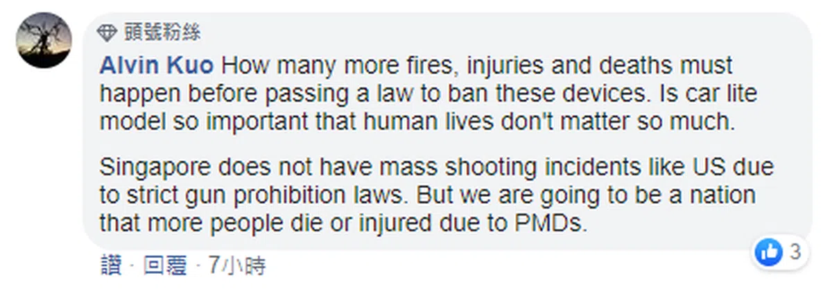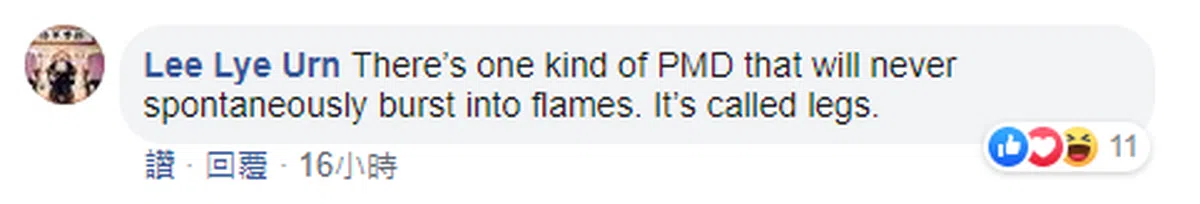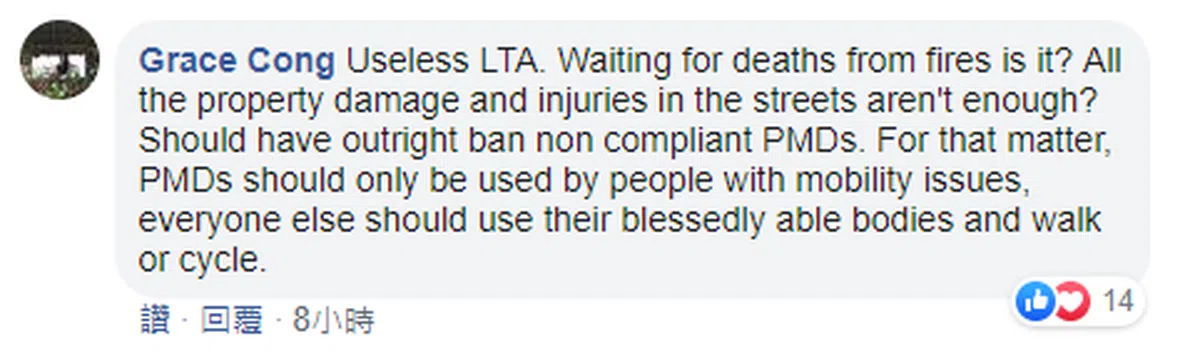“没用的陆交局。等着火患造成死亡是吗?所有财产损失和街上的受伤案例还不够吗?(陆交局)应该全面禁止不符合规定的个人代步工具。这样说来,个人代步工具应该只允许有移动障碍的人们使用,其他人应该用他们受祝福的完整躯体来走路或骑脚踏车。”