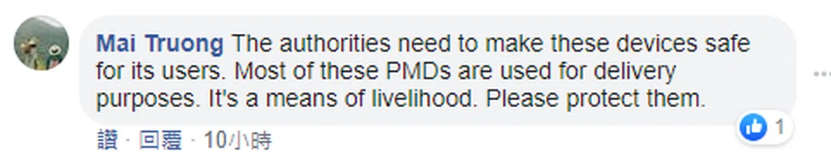 “有关当局必须确保这些(个人代步)工具对使用者是安全的。大多数个人代步工具都作为外送用途,那是别人吃饭的工具,请保护他们。”