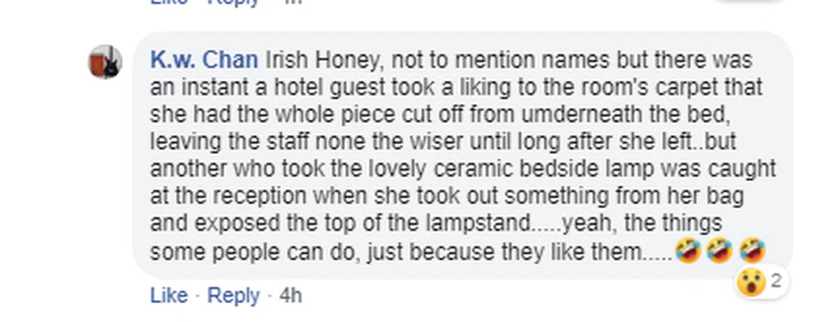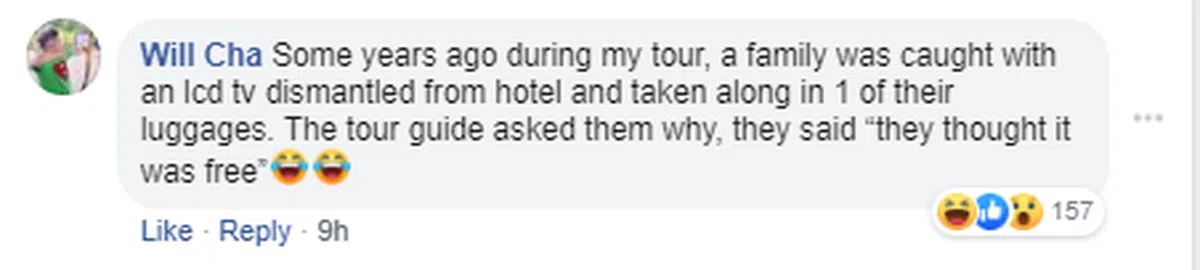 是的,本地网民纷纷大爆料他们旅游时曾见过团友牵走的酒店物品,种类应有尽有,让红蚂蚁目瞪口呆。有的为了掩人耳目故意选择剪床底的地毯再偷走、有的偷走精美的陶瓷床头灯、有的甚至拆走液晶电视机、有的偷走床单、枕头、电话、浴帘、遥控器等。最夸张的是,还有人把迷你保险箱放进行李箱,一拖就拖走。