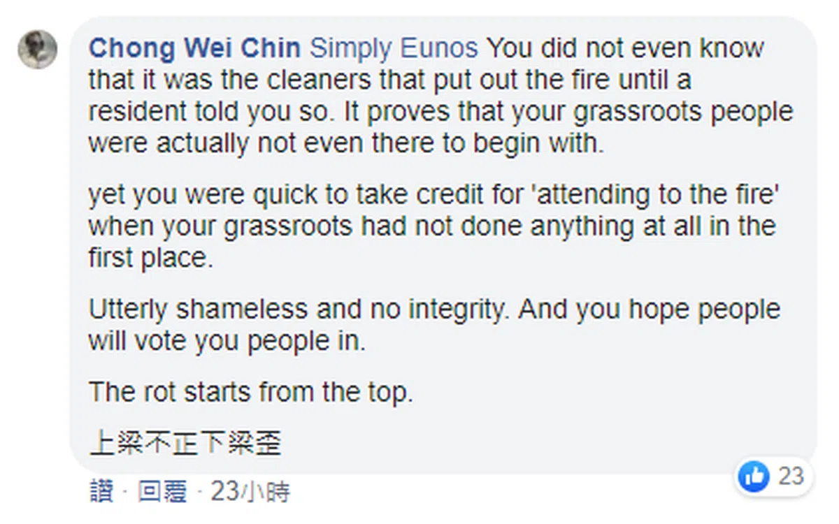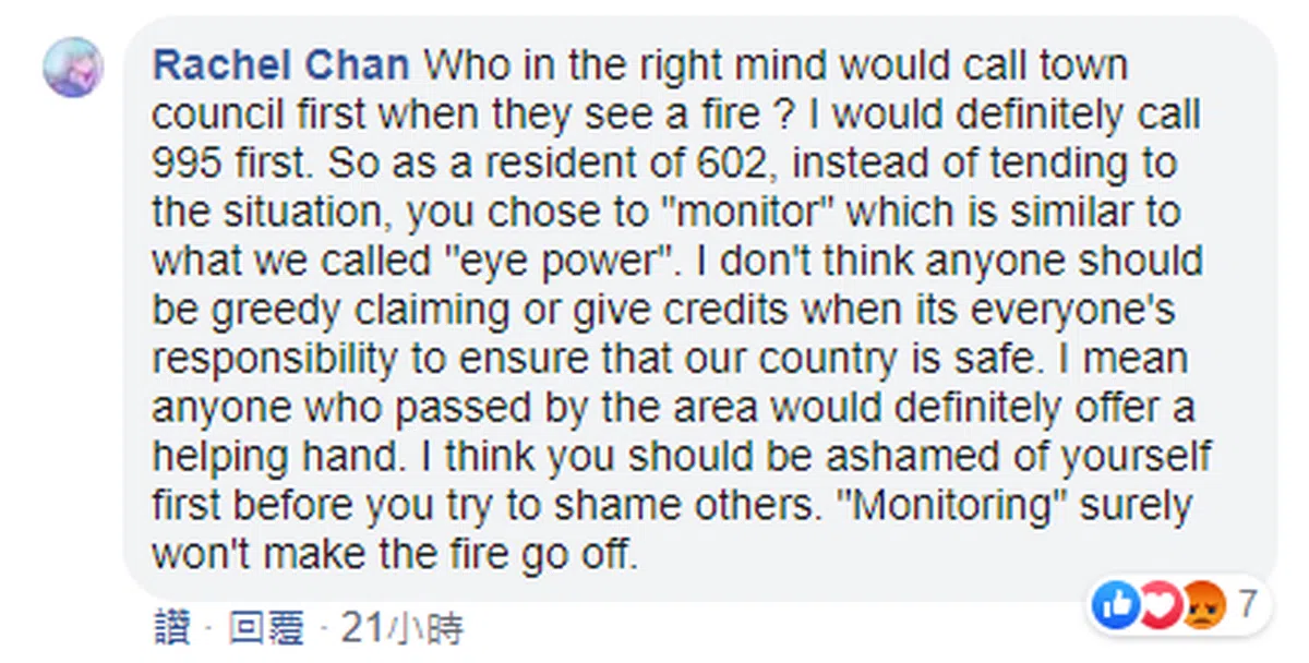 “如果不是有一名居民告诉你,你根本不知道是清洁人员扑灭的火势,可见你们的基层领袖一开始根本不在现场。你们的基层领袖根本什么都没做,却急着邀功,说成是你们去处理火患(attending to the fire)……”