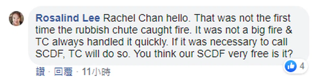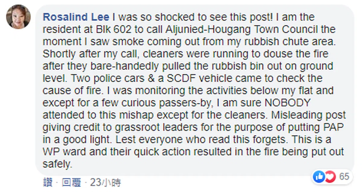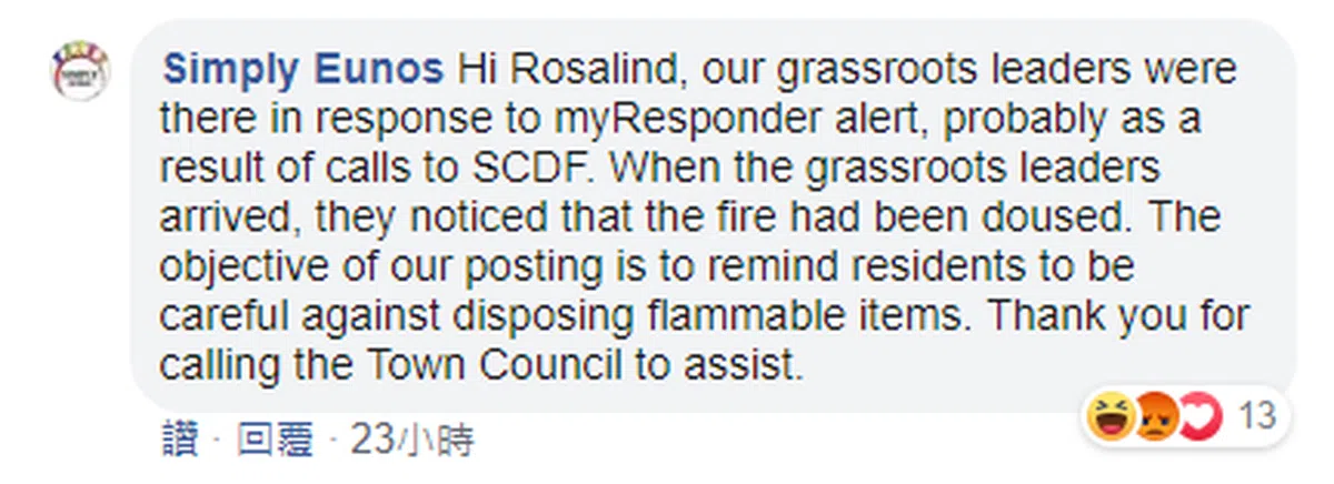 面对打脸留言,“Simply Eunos”在下方留言澄清两位基层领袖抵达时,火势已经被扑灭了: