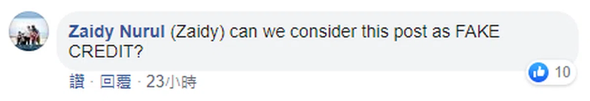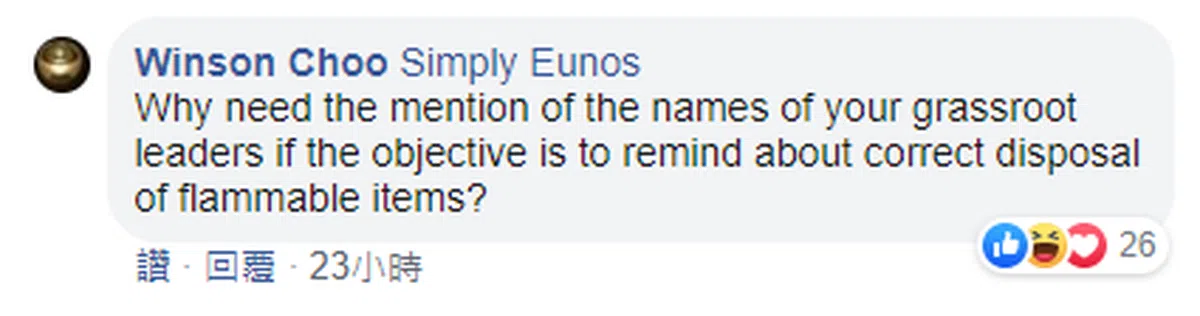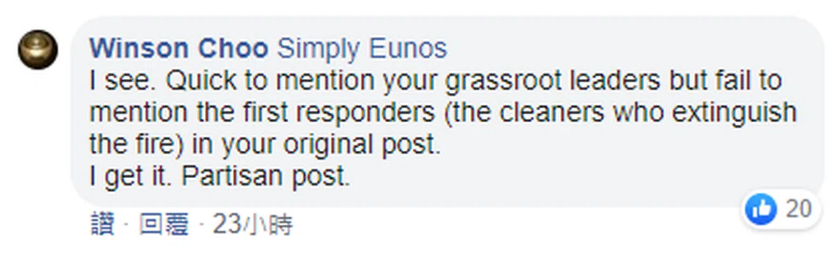 “原来是这样。在你原来的贴文里忙着提你们基层领袖的名字,却不提扑灭火势的清洁人员。我懂了,有政党倾向的贴文。”