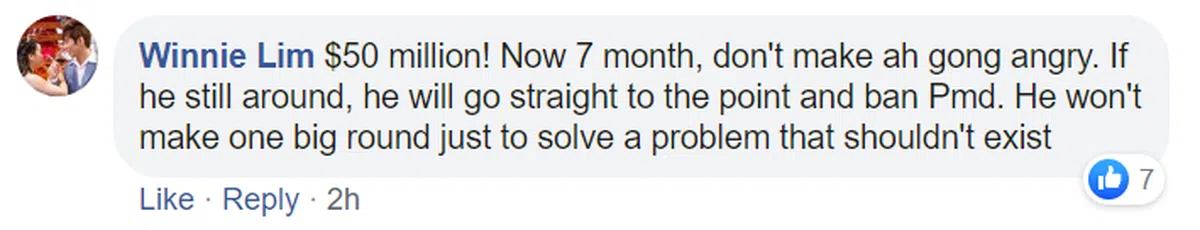 “5000万元!!现在是农历7月,不要让阿公生气。如果他仍建在,会直截了当禁止PMD。他才不会绕一大圈来解决一个本来就不该存在的问题。”
