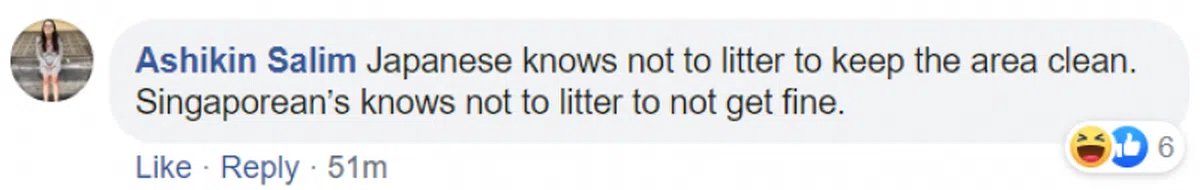 Ashikin Salim网民给大家来一个精辟总结:日本人知道不应该乱丢垃圾,是因为这样能保持环境整洁。新加坡人知道不应该乱丢垃圾,是因为丢了会被罚款。