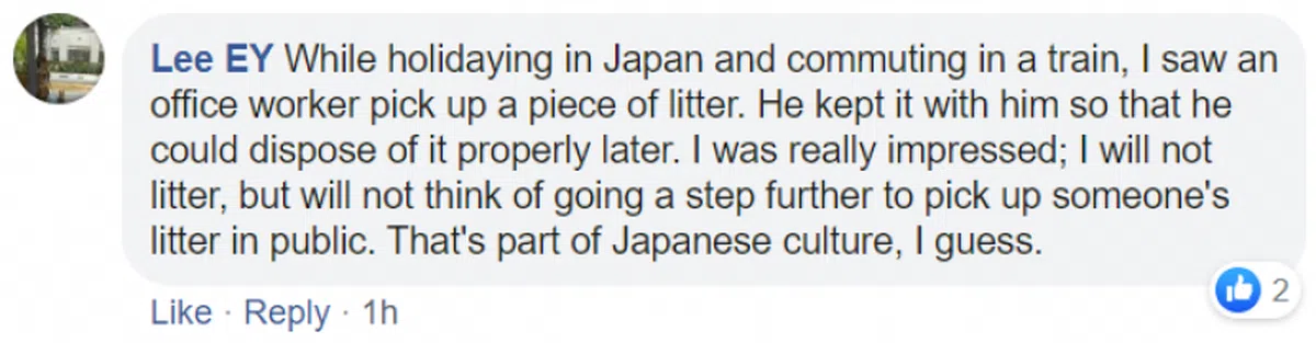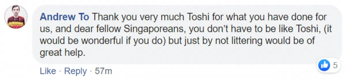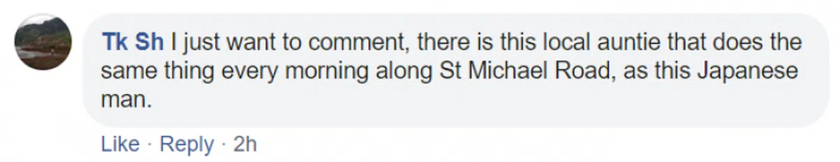 有网民留言爆料说,其实在黄埔(Whampoa)一带的圣迈克路上,每天早上都会有一名本地Auntie大妈在做着和Toshi先生同样的事——沿路捡垃圾。意思浅浅,就是说:新加坡人也有默默无闻的好公民啦,只是你我没有碰巧遇见而已,也没有人在网上宣扬。
