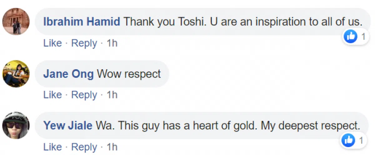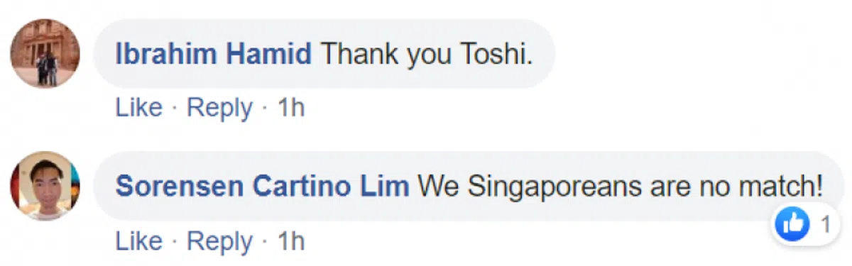 Ivan的这篇帖文今天在面簿上火爆式地疯传:被分享了超过6400次,有1万多人点赞,2000多人点了爱心符号。留言超过700条,大多数都是感谢Toshi先生,敬佩他以身作则帮新加坡保持环境整洁,认为他是“最启发新加坡人的日本人”。