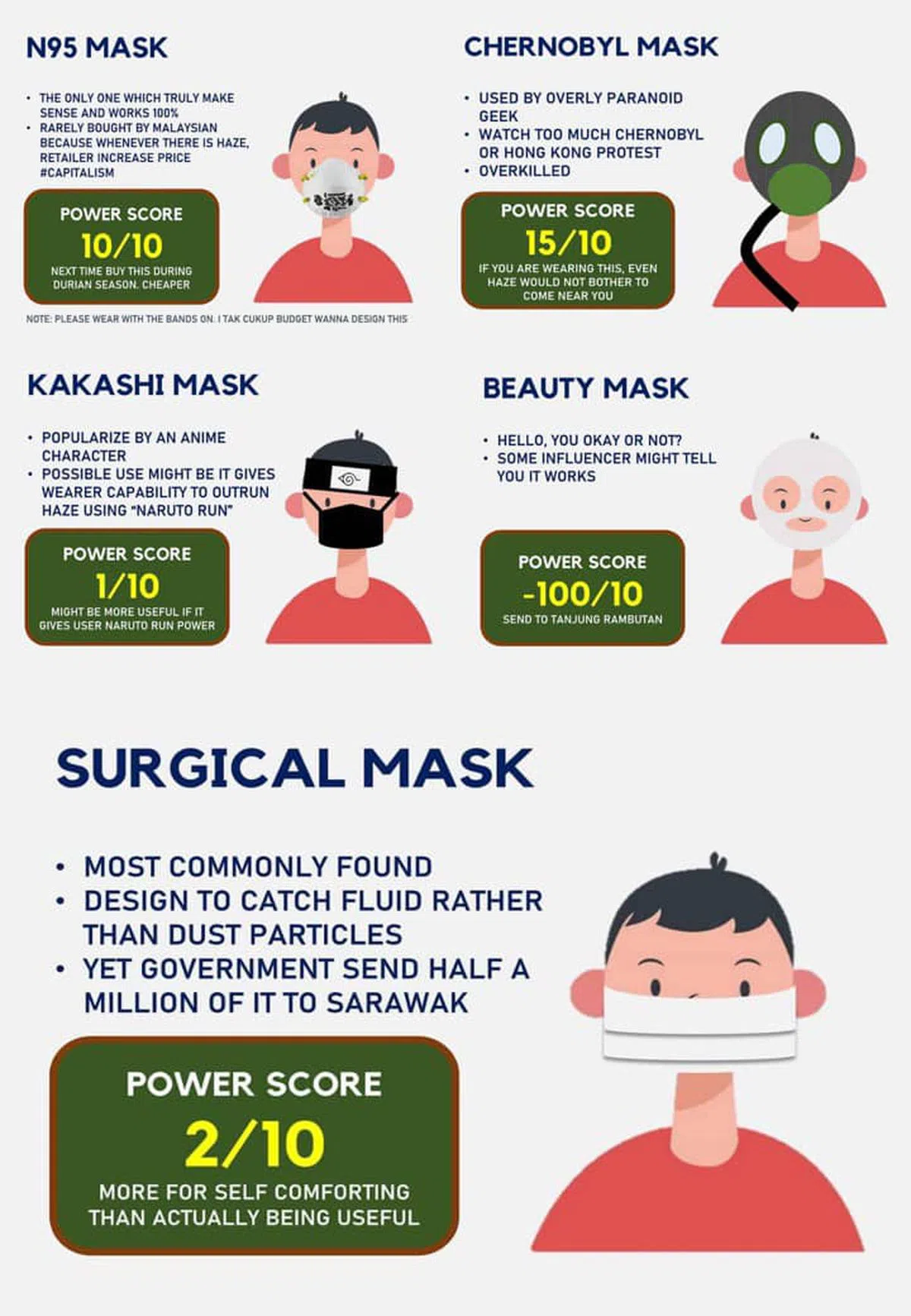 这张图片还以令人莞尔的方式介绍了其他几种口罩,并予以评价和评分。