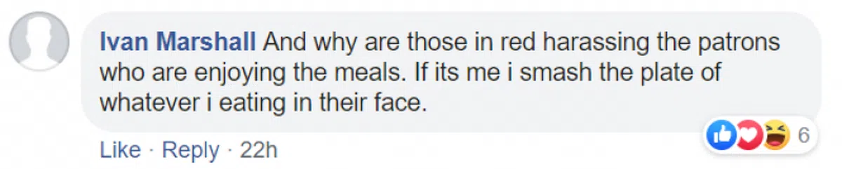 “那些穿红衣的为什么在骚扰那些正在享用美食的公众?换作是我,可能会直接将盘中餐砸向他们脸上。”