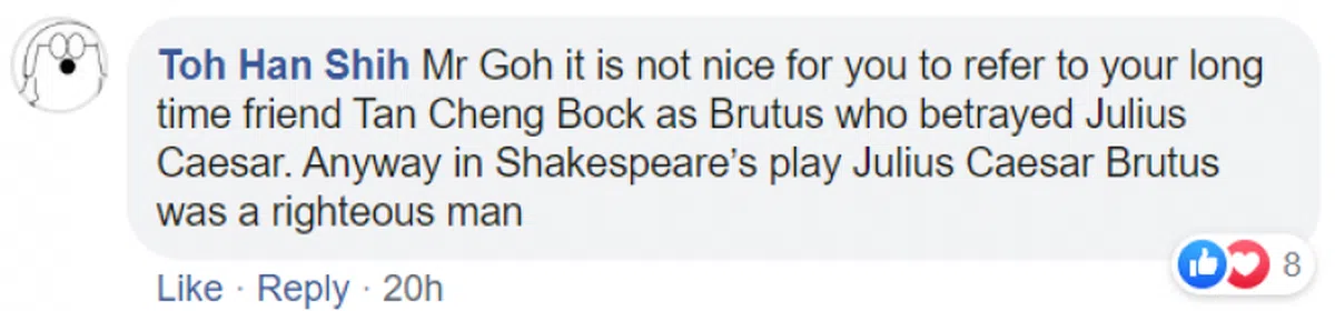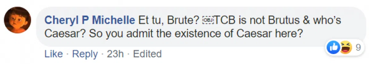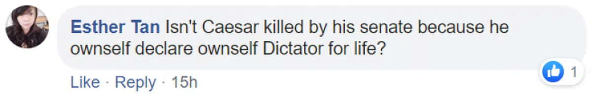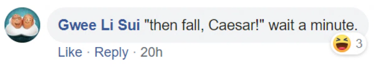 如此热烈的留言区,本地漫画作者及诗人魏俐瑞也来凑一份热闹。简单地提醒大家别忘了这句话还有下半句:‘那就倒下吧,恺撒!’,等一等。