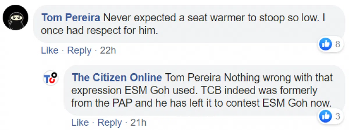 Tom Pereira网民说:我原本相当敬重老吴的,没想到他这个暖席者竟出此下策。对此,The Citizen Online网民站出来维护老吴说:吴资政用这个比喻没什么问题。陈清木曾经是人民行动党党员,他的确已经离去,与吴资政分庭抗礼。