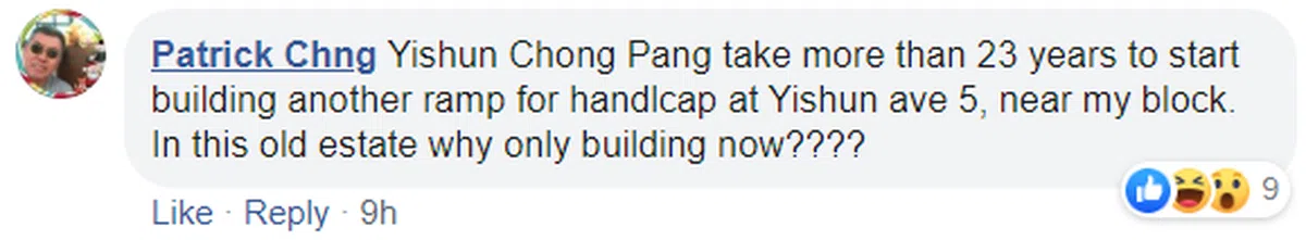 有住在义顺中邦的居民指出,七年算什么,已经算快了。在行动党管理的义顺5道,他住家隔壁的那座政府组屋,足足隔了23年才开始为残疾人士兴建另一条斜坡。