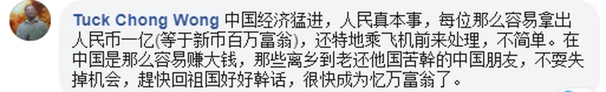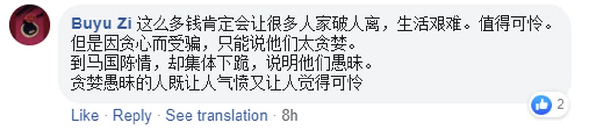 在场的一名受害者也表示,来到马国大使馆前的数百名中国人仅是受骗案件的“代表”,实际上在中国还有至少300万人受骗,被刮走的资金总额高达5000亿人民币(约1630亿新元)。