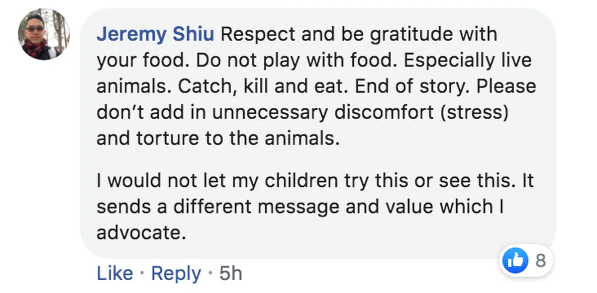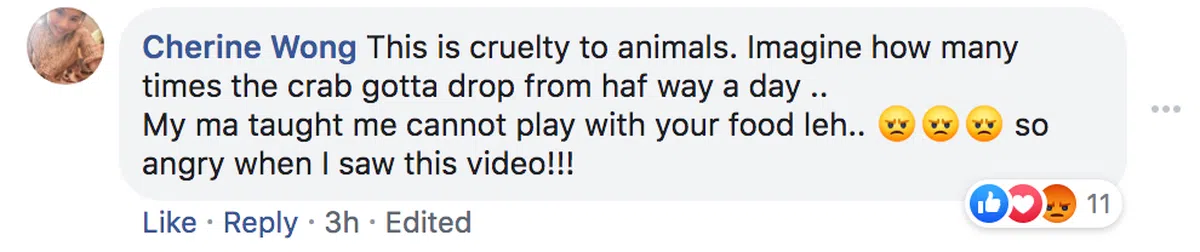 另外,也有网民提到自己看完视频后感到愤怒,并表示无法想象这些螃蟹在夹取的过程中从高处摔落过多少次。她也提到另一个多数网民都有共鸣的点,那就是父母从小教育我们:不要玩弄食物。