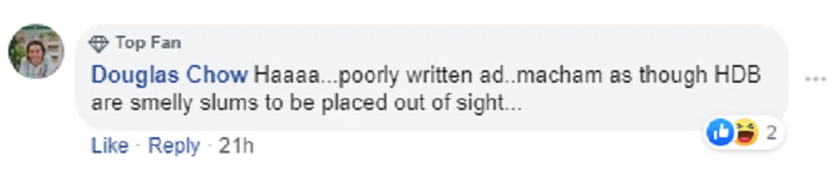 这位网民说:“这个广告也写得太差了吧,仿佛政府组屋是臭气冲天的贫民窟,需要放在视线之外……”