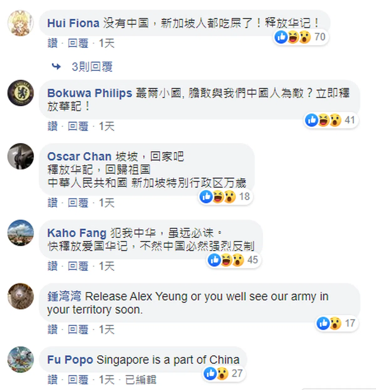 随着事件发酵,近日新加坡驻香港总领事馆的面簿涌入大量辱骂新加坡、并警告新加坡释放杨官华的留言。