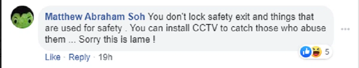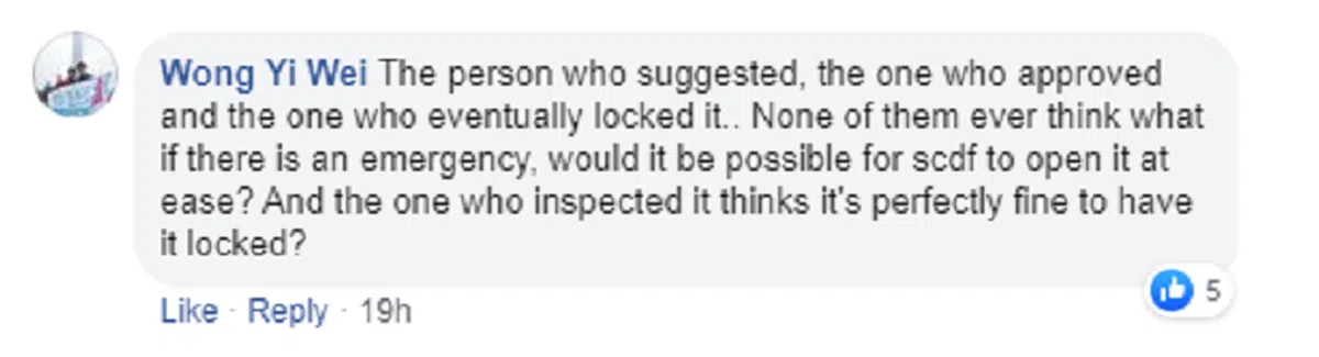 这名网民也质疑说,建议(上锁)的人、批准的人、最后锁上的人,这当中竟然没人想过万一发生紧急情况,民防部队能不能轻松打开它?而负责检查的人,也认为把它锁上是完全没问题的?