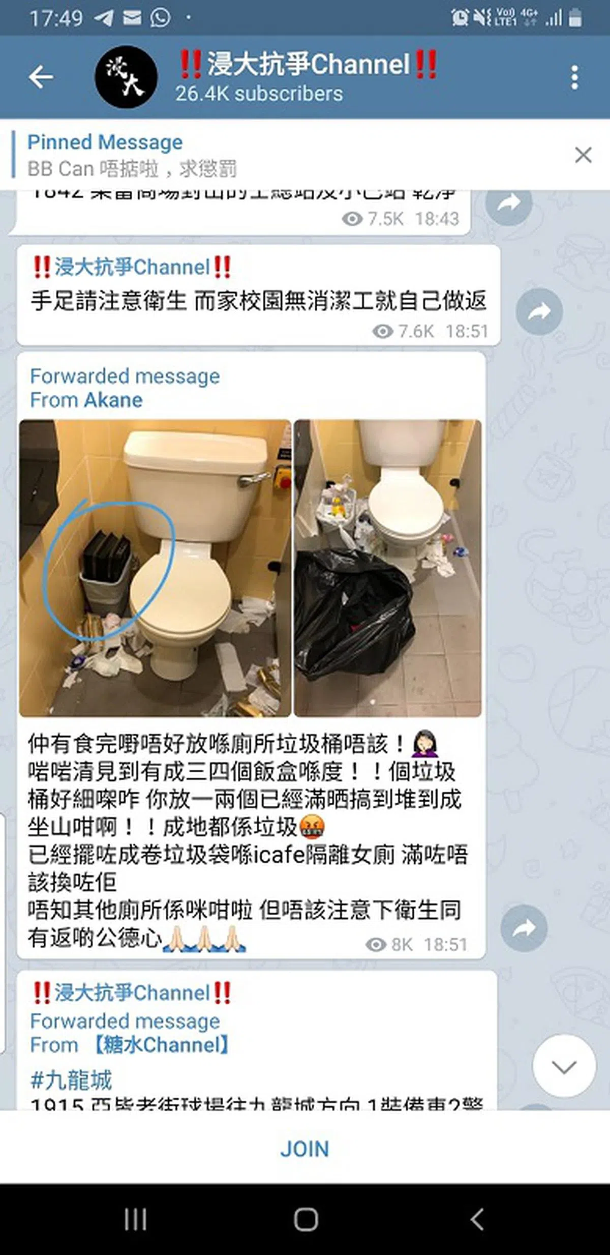 红蚂蚁在示威者们互相传达信息的“浸大抗争”telegram上,就看到有关人士呼吁示威手足要注意卫生,因为校园内没有清洁工来做打扫,那么这些工作就得自己来做。