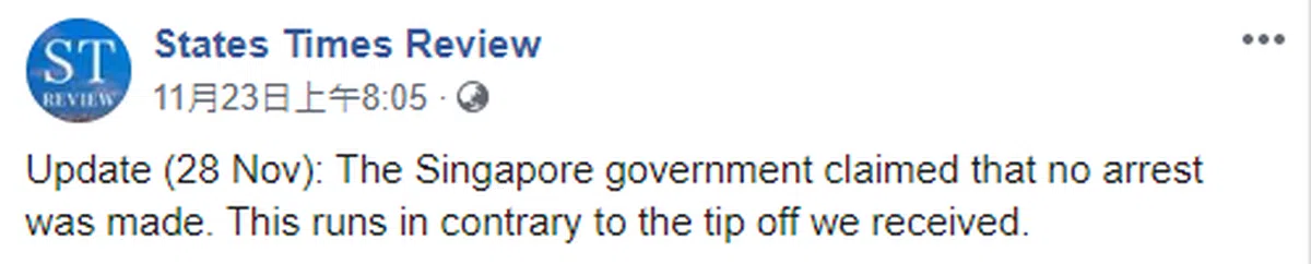 “11月28日更新:新加坡政府宣称没有任何人被逮捕。这个说法和我们收到的消息有出入。”