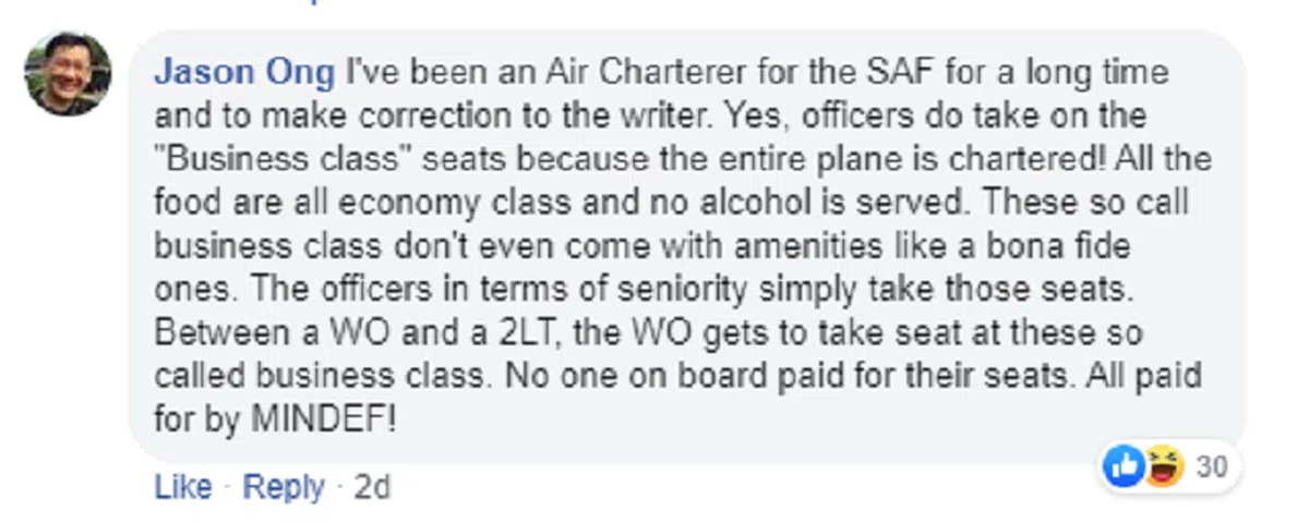 我在服兵役时认识的一位军官,他最近去澳大利亚参加军事演习。我从他的社交媒体账户上看到,他乘坐的是新西兰航空公司的商务舱。 另一位朋友,他是全职国民服役人员,军衔属于低级别的。同样的,几年前他也乘搭商务舱去参与军事演习。 因此,似乎只要是军官,无论是正规军人还是全职国民服役人员,都可以享受乘坐商务舱执行海外任务的特权。 整个航班若被武装部队包下,或军官自掏腰包升级座位,这种做法或许是可以被接受的,但我很好奇有必要这么做吗? 是因为军官需要有私人空间来处理敏感文件吗?有些人可能会说,他们为国家服务,应享有坐商务舱出行。但如果这是依据,那么所有士兵也应该乘坐商务舱,因为他们的贡献也不是微不足道的。 如果有正当理由,我可以接受这样的安排,要不然市民可能会认为这是在滥用纳税人的资源。毕竟,商务舱的票比经济舱的票贵多了。
