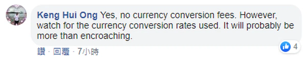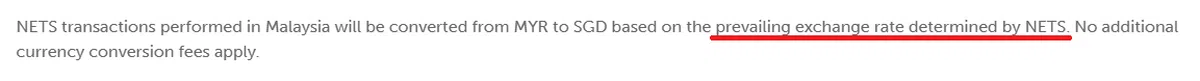 这句话值得玩味,一方面兑换率不是透明公开的,使用者只能在结账后通过账单得知自己用了多少新元来买东西,另一方面兑换率由NETS订定,兑换率究竟会不会比兑换现金来得划算对使用者而言也是未知数。