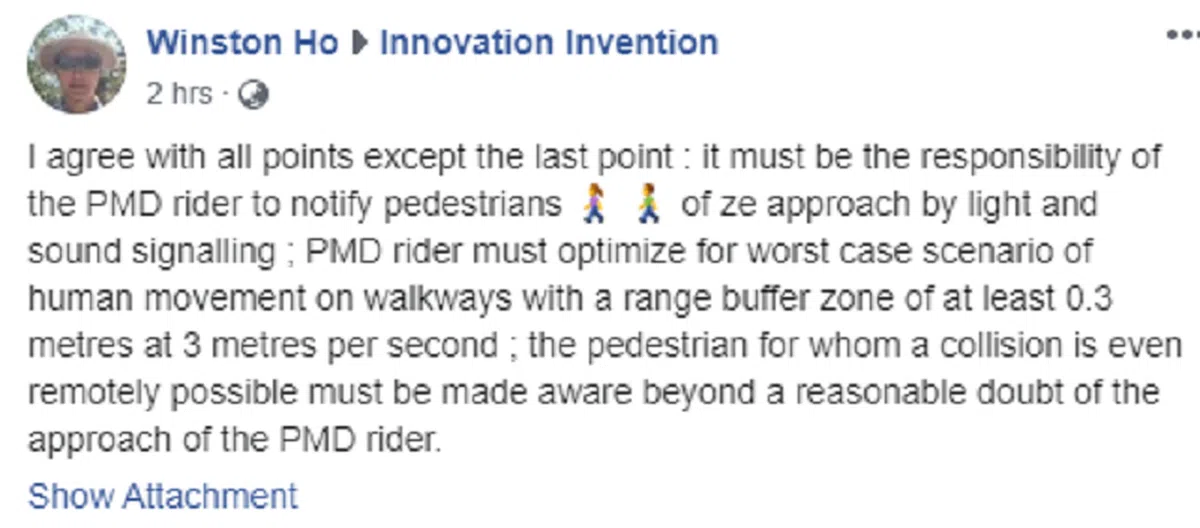 网民认为光是这五条新条例还远远不够,有人认为电板车骑士在靠近行人之前,有责任通过声音或发光信号来通知行人。电板车在脚车道上也应该与行人保持一定距离(时速每秒3米时,与行人应保持至少0.3米的安全距离),这样一旦出现意外时,骑士和行人都能有足够的时间闪躲。
