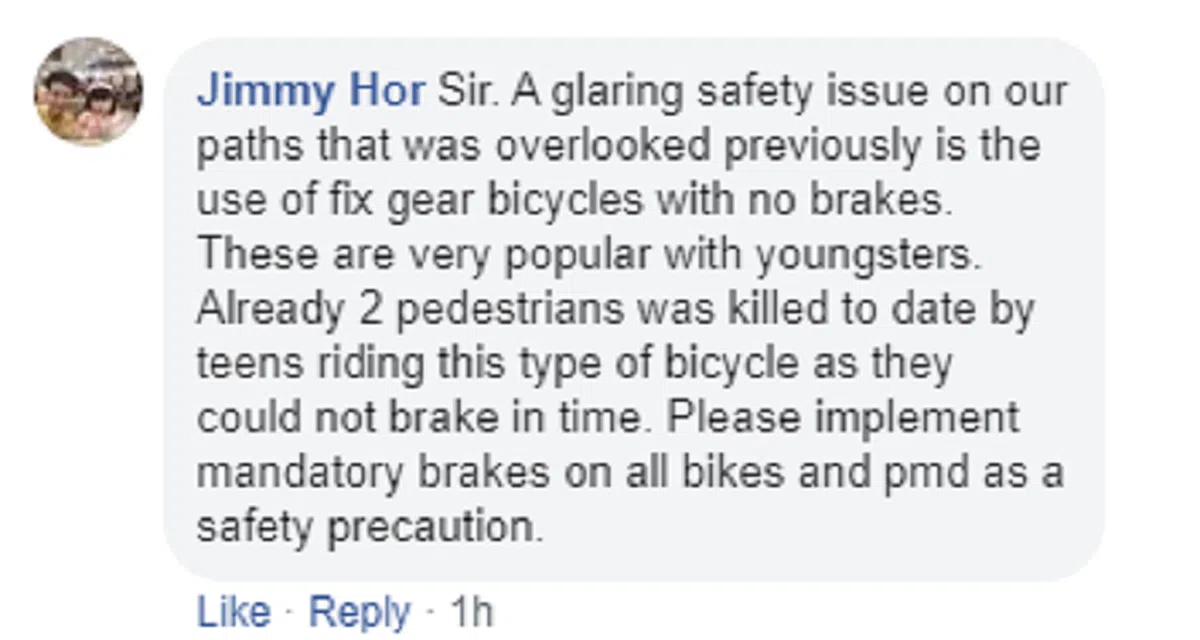 这名网民呼吁当局也应强制规定所有脚踏车和电板车都配有刹车装置。也有一些网民认为,脚踏车骑士也应通过理论测试。