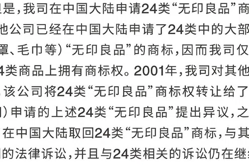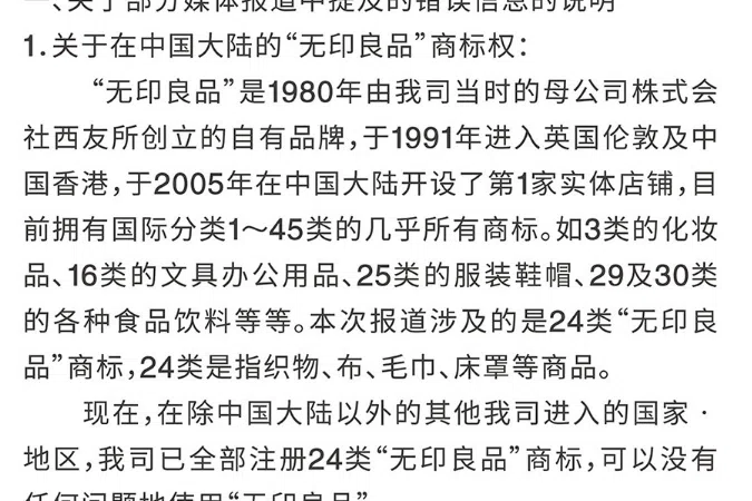 日本株式会社良品计画2018年在“天猫无印良品MUJI官方旗舰店”郑重声明中表示,在中国申请24类“无印良品”商标时,发现其中大部分商品已被注册。