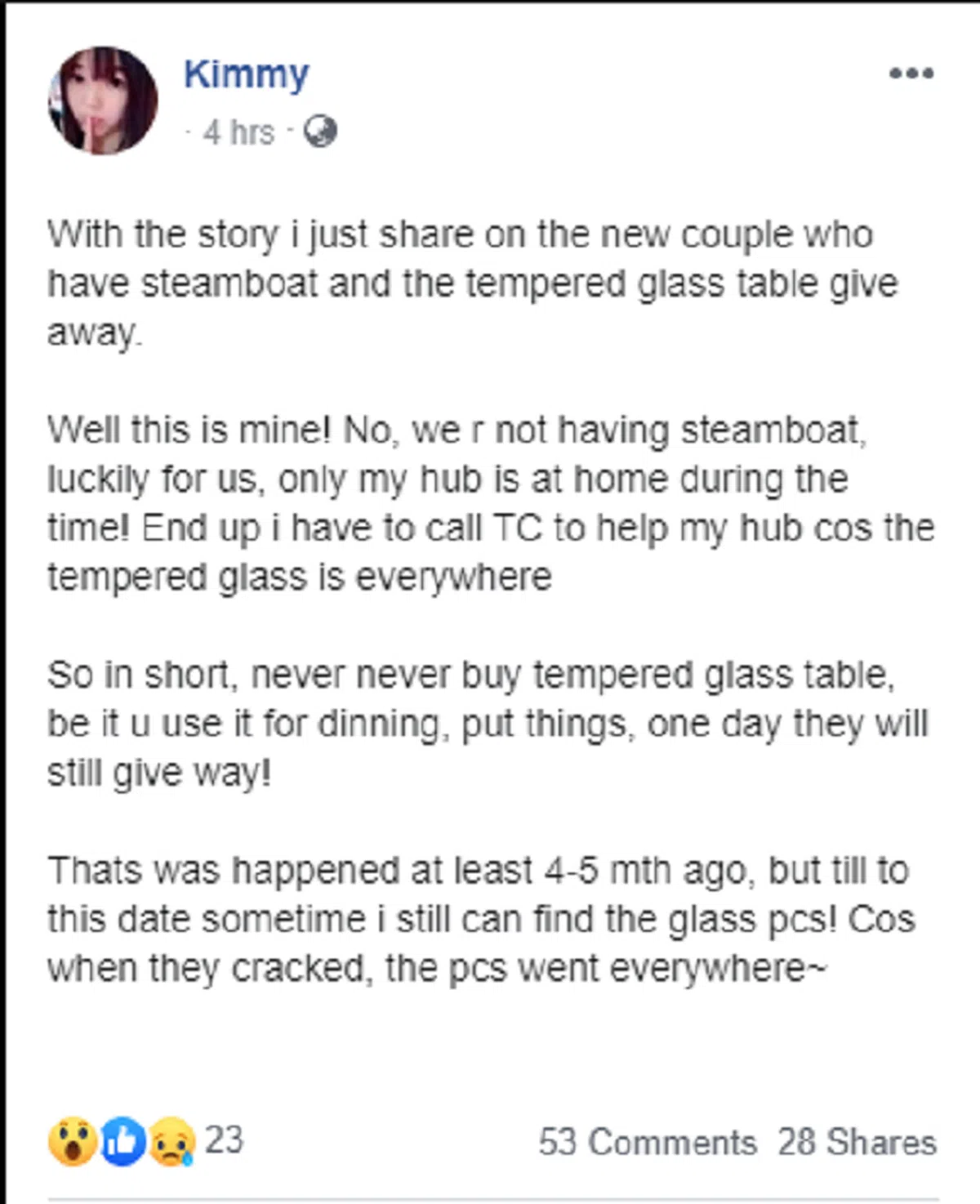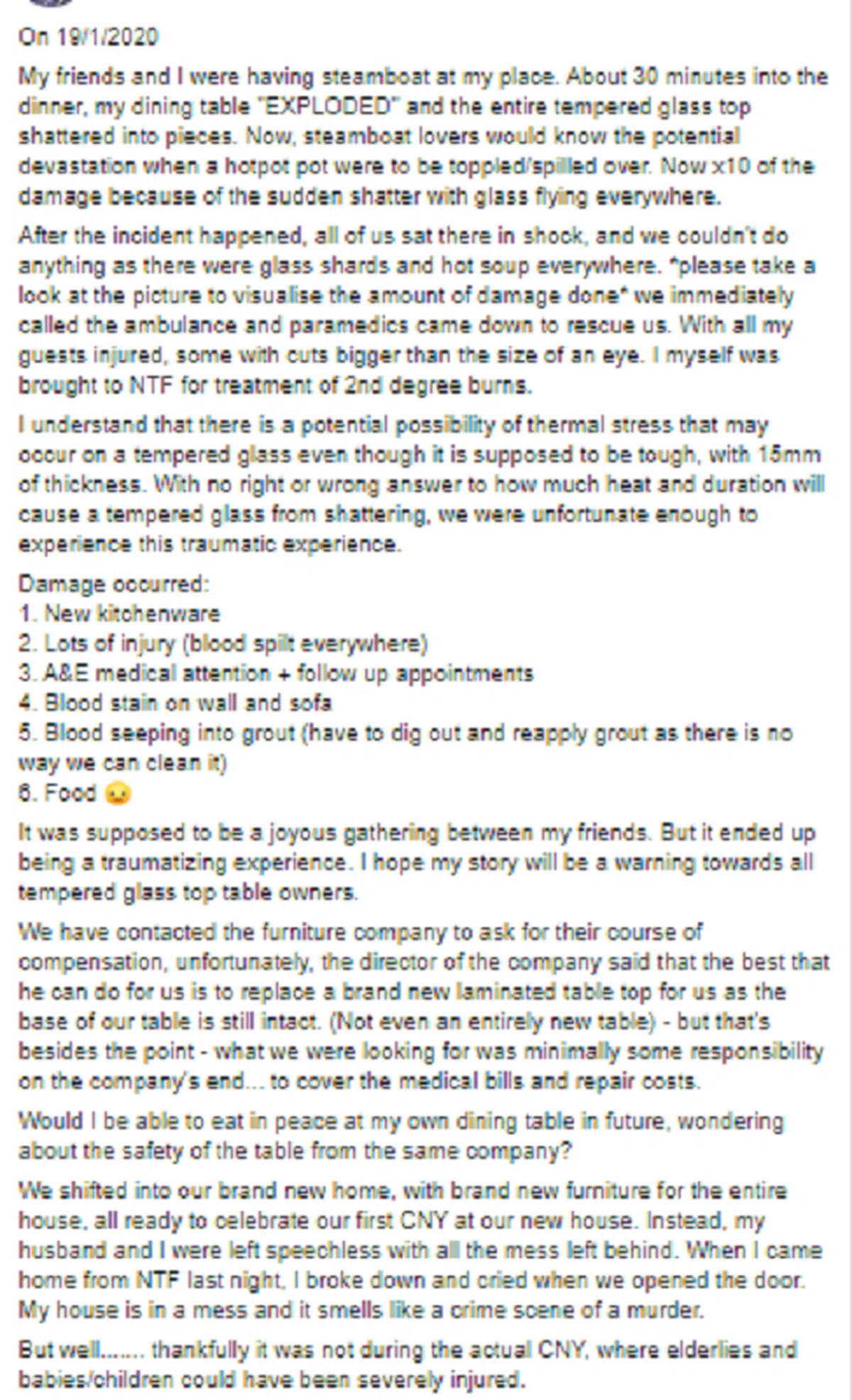 她接受《联合晚报》采访时说,自己和丈夫去年6月从家具商那里买来这张桌子,“我们用了半年,而期间都有在桌上吃过数次火锅都没事,没想这次会发生事情。”