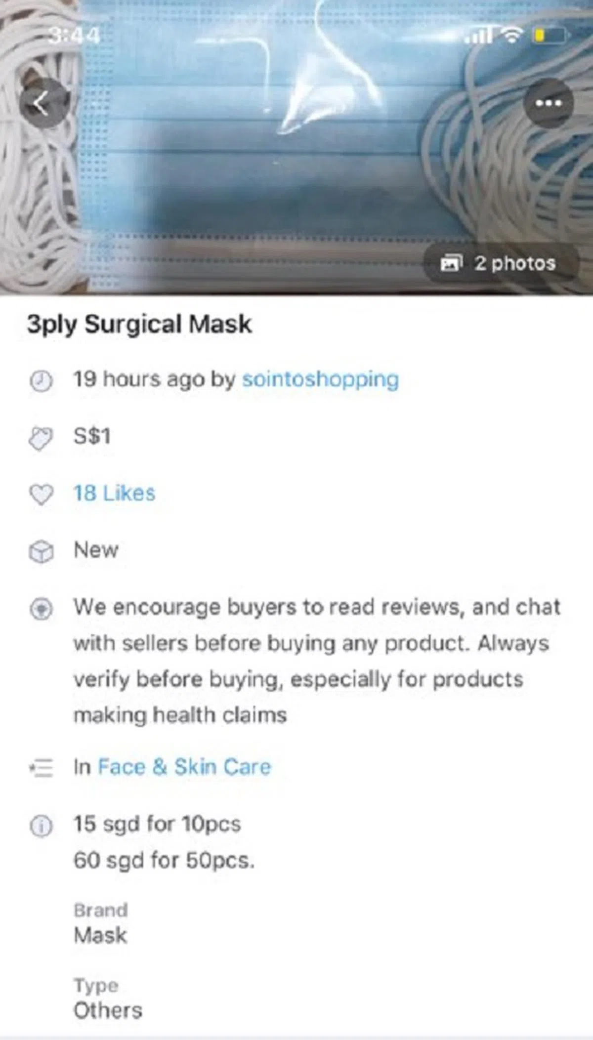 有买家更从日本人肉提口罩回新加坡售卖,一片要价两新元,一盒60片要价90新元,三盒180片要价240新元。
