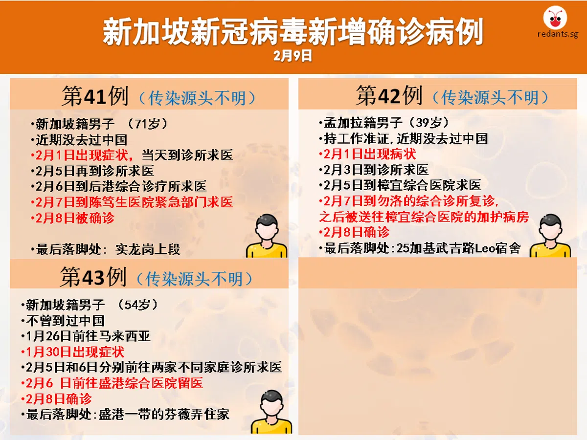 根据卫生部公布的资料,第48名确诊病患持有本地工作准证,住在加基武吉路的客工宿舍Leo Dormitory,他在本月1日出现病状,3日到诊所求医,5日到樟宜医院求医。之后,他于7日到勿洛综合诊所复诊,当天就被送往樟宜医院的加护病房,8日被确诊后转入国家传染病中心加护病房。