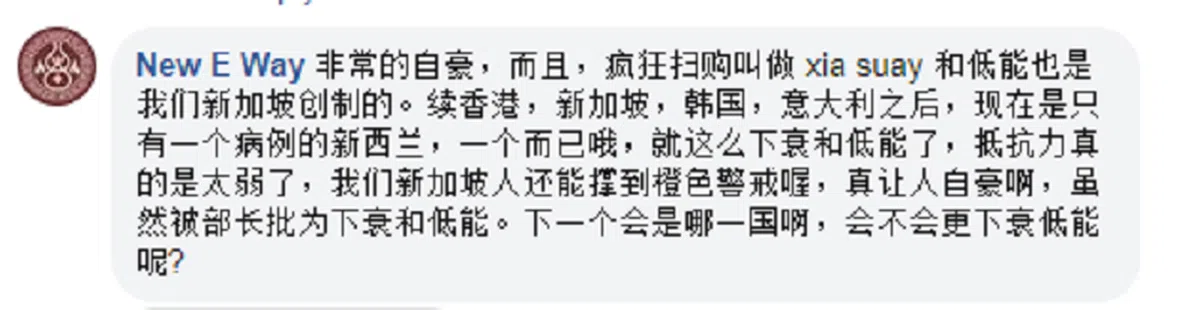 看了各国“后来居上”的抢购风之后,我国网民纷纷觉得,新加坡撑到橙色警告才来抢购,忍耐度在全球排名榜上算是很不错了,甚至有点小自豪。