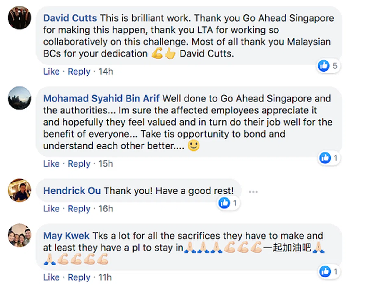 在前进巴士公司的面簿贴文下,不少网友送上打气和鼓励的留言,大部分都称赞前进对于受影响巴士车长们所采取的安排。也有部分留言向那些为了工作,选择两周不得回家的员工们表示敬意和谢意。毕竟没有这些巴士车长们,本地民众的出行也将会变得极其不方便。