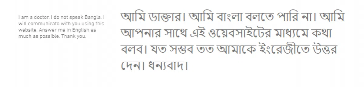 “我是一名医生,我不会说孟加拉语。我将透过这个网站和你对话,请尽可能用英语回答我。谢谢。”