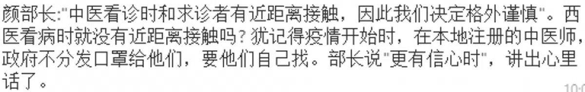 当然,也有网民帮颜部长说话。他们猜想,部长不让中药店全面恢复营业,应该是考虑到年长人士的安危。毕竟会光顾中药店的,以年长人士居多。