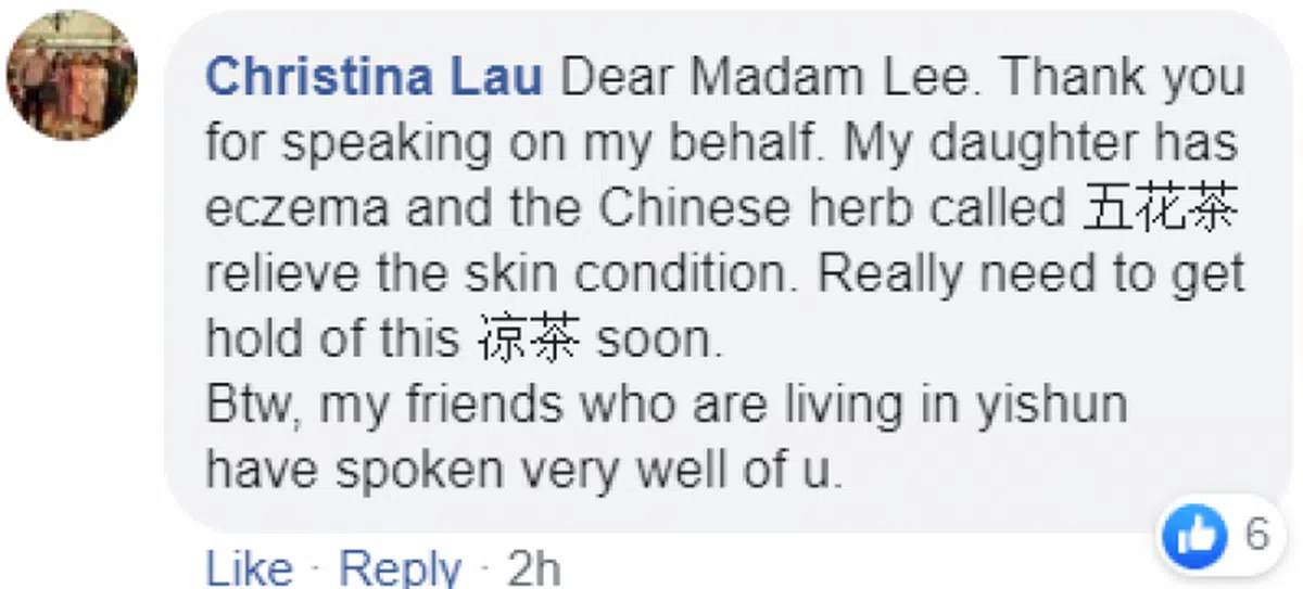 也有为人父母感激花姐说出了她的心中话,声称自己的女儿患有湿疹,必须用中药五花茶来舒缓皮肤的症状,她真的很需要尽快能买到这种凉茶。