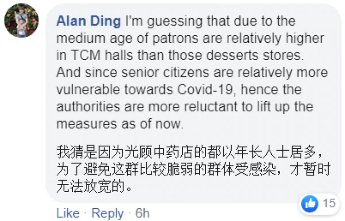 “我有很多居民要求到中药店买药来煲汤加强免疫系统,所以这是否能纳入其中一个优先考量?你允许甜品店在12号重开,我相信中药店也会遵守安全距离措施、戴口罩等等。”