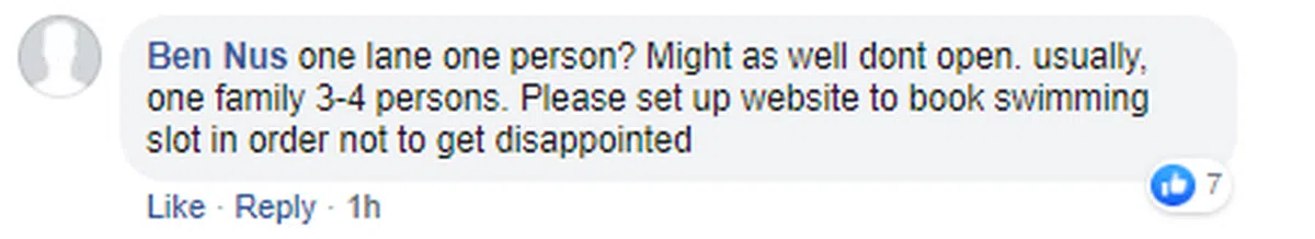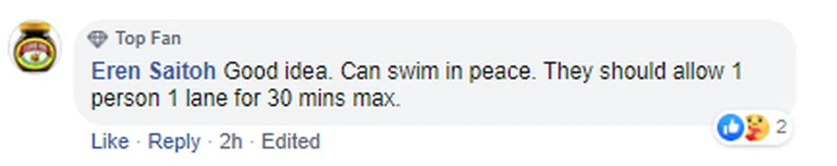 他也建议当局为了不让公众失望,请务必开通预约服务,让公众能够提前预订游泳时段,以先到先得的方式。