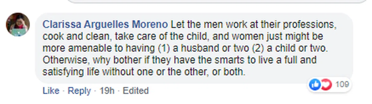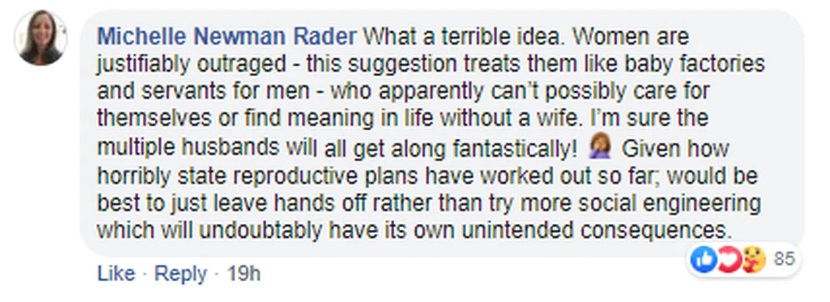 这位女网民就说,多糟糕的主意啊。女人们看了如此愤怒是有道理的。这种说法把女人当成了生孩子的工厂和男人的仆人。难道男人没了妻子就不可能照顾好自己?就找不到人生的意义?