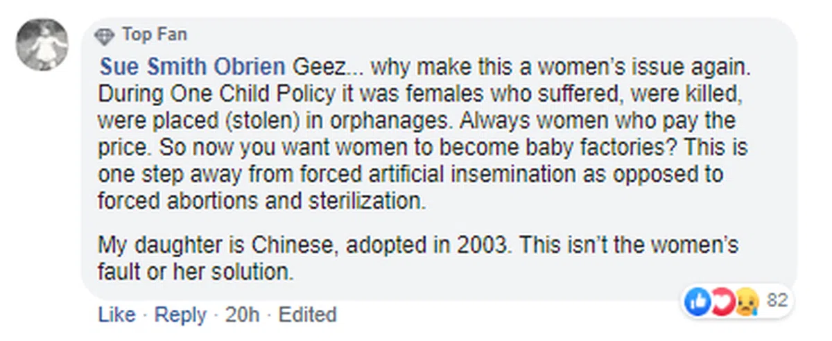 另一位女性网民也说:“天啊……为什么把“男多女少”的问题再次成为女性的问题呢?在一胎化的政策中,受害的是女性,她们被杀害,被送到孤儿院。为何总是女人要付出代价?