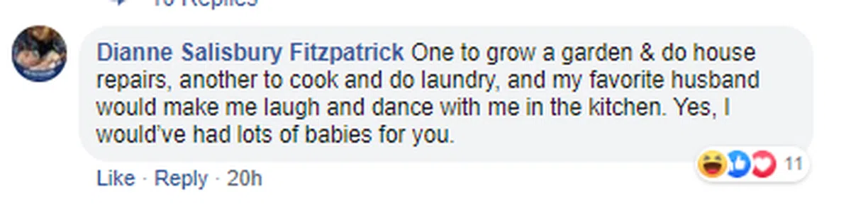 另一位女网民也说,一个老公种花和修理房子,另一个做饭和洗衣服,我最喜欢的老公就负责逗我笑,和我在厨房跳舞。是的,如果这样,我会为你生很多孩子的。