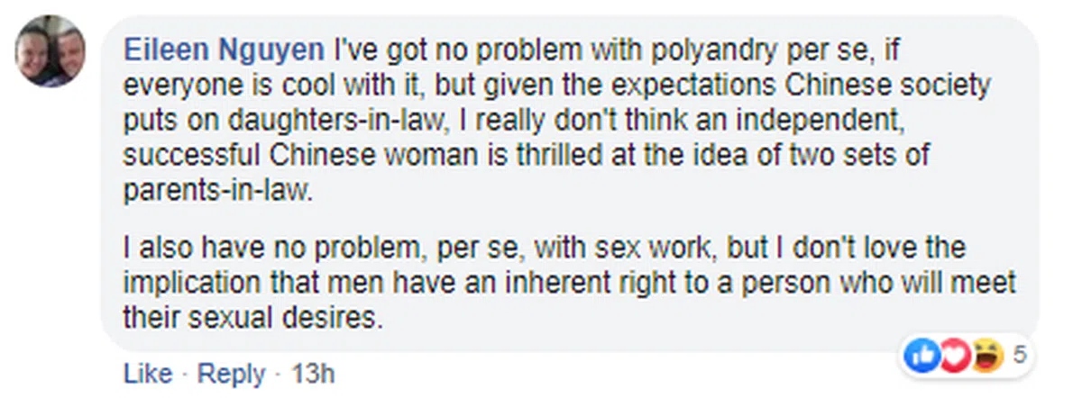 她说:“如果每个人都能接受的话,我对一妻多夫制本身没有问题,但考虑到中国社会对儿媳的期望,我真的不认为一个独立、成功的中国女性会对有两个公婆感到兴奋。从本质上说,我对性工作也没有问题,但我不喜欢这种暗示,即男人对一个能满足他们性欲望的人有与生俱来的权利。”
