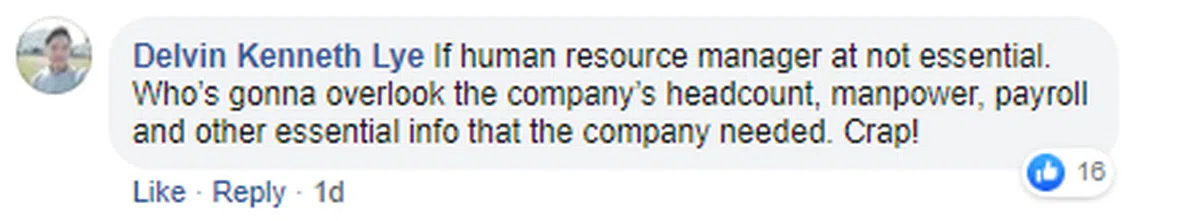 “如果人事部经理不在必要行业之列,谁负责看顾公司的员工总数、人力资源分配、工资和其他公司所需的重要信息呢?废话。”