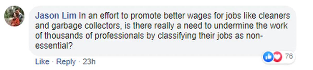 “为了提高清洁工和垃圾收集等工作的工资,真的有必要把成千上万的专业人士的工作划分为非必要工作吗?”