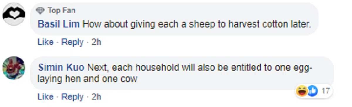 当然也有人泼冷水。有网民调侃说,保姆政府下次会不会给我们免费派送羊、鸡、牛等,让我们自给自足,自产棉花(其实是在酸某名部长)、鸡蛋和牛奶?
