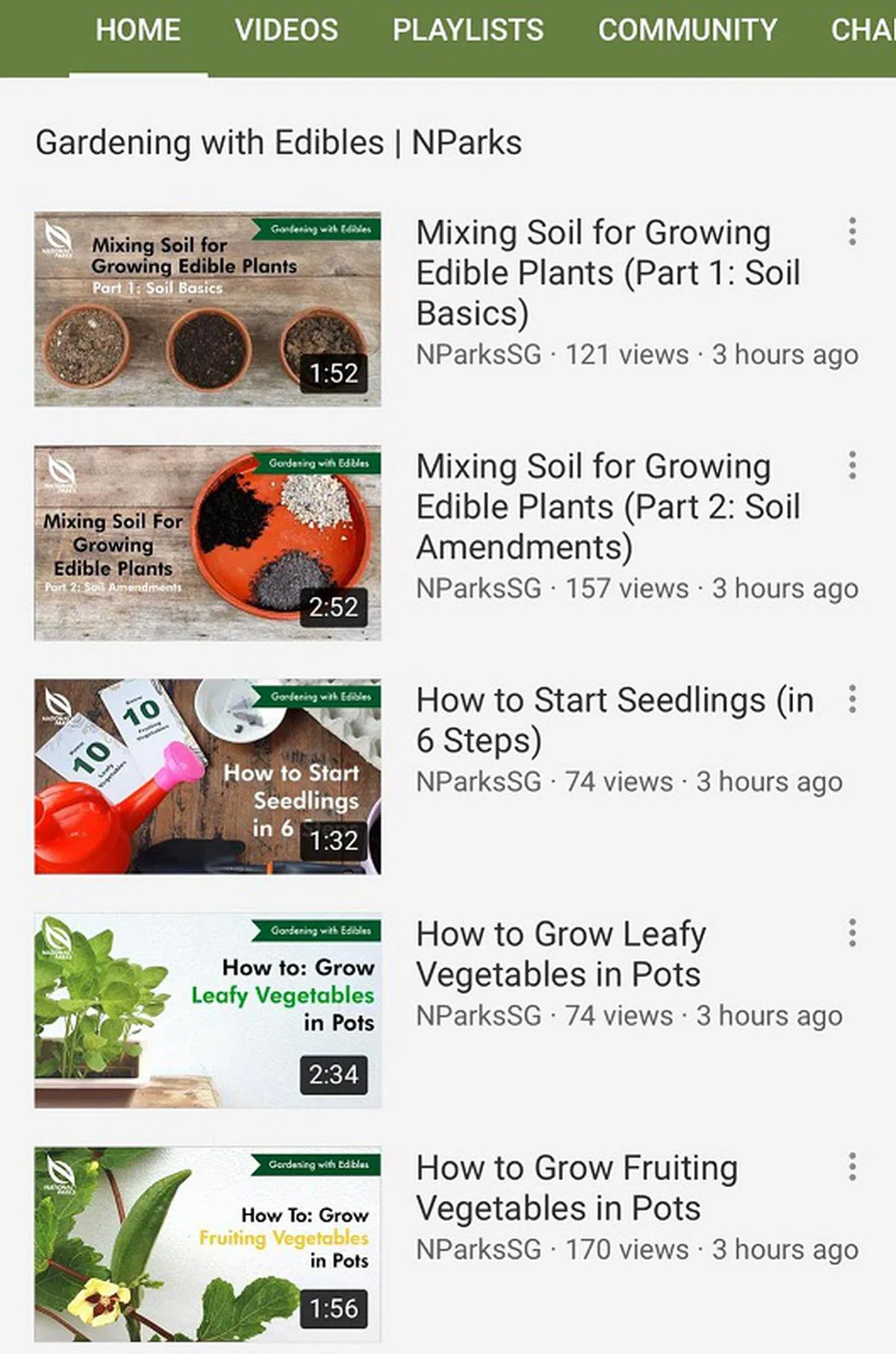 如果看文字学种菜还是很难,也不用担心,操碎了心的公园局还在Youtube频道“NParksSG”和面簿“NParksBuzz”等社交媒体上都 上载了指导视频。